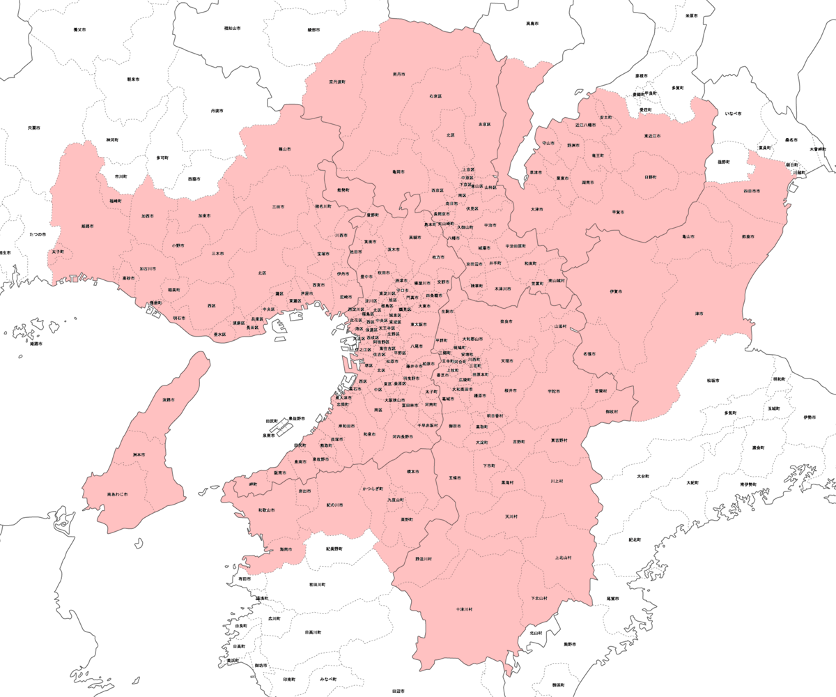 大阪市,堺市,高槻市,東大阪市,豊中市,吹田市,茨木市,枚方市,寝屋川市,八尾市,岸和田市,池田市,箕面市,豊能郡,能勢町,豊能町,